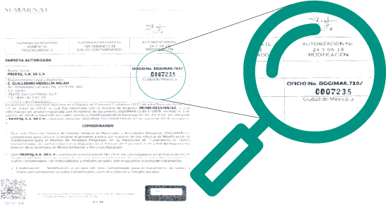 PROFIQ es la única empresa en México con autorización de la SEMARNAT para tratamiento y manejo de residuos industriales (clase I y clase II). Todo esto a través de Nanotecnología de remediación e inmovilización in situ o en nuestra planta, ubicada en San Luis Potosí .
